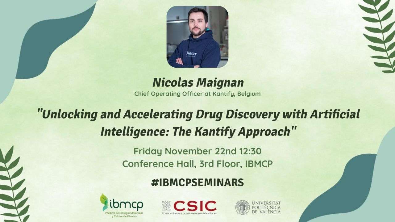 Kantify has been invited by the Valencian Institute for Plant Molecular and Cellular Biology (IBMCP) to deliver a lecture "Unlocking and Accelerating Drug Discovery with Artificial Intelligence: The Kantify Approach". Join us to explore how advanced artificial intelligence (AI) technologies are transforming the landscape of drug discovery, specifically focusing on small molecule and target discovery in plant biotechnology.