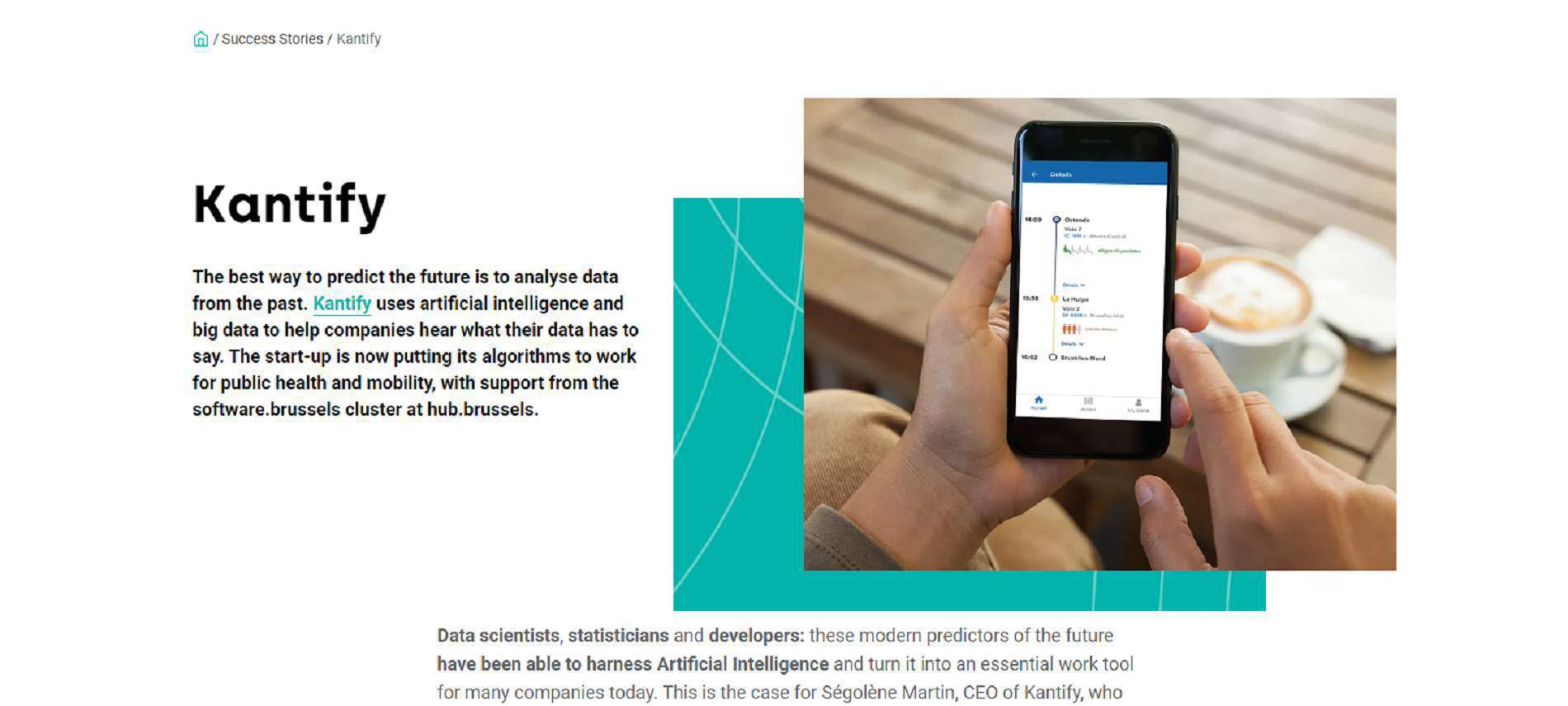 Kantify was starred as Brussels AI success story by hub.brussels, a business cluster bringing out the best of Brussels in terms of innovation, internalization, and socio-economic impact. Kantify joined the software.brussels cluster of hub.brussels in 2016. Our CEO Segolene Martin, is also a member of its board since 2018.