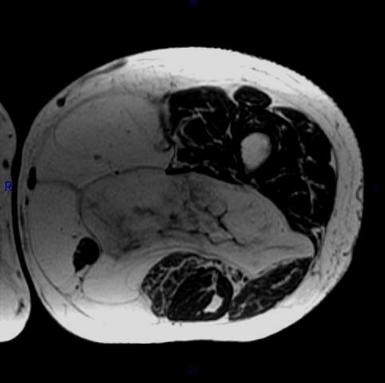 Axial T1-weighted MRI of a well-differentiated liposarcoma