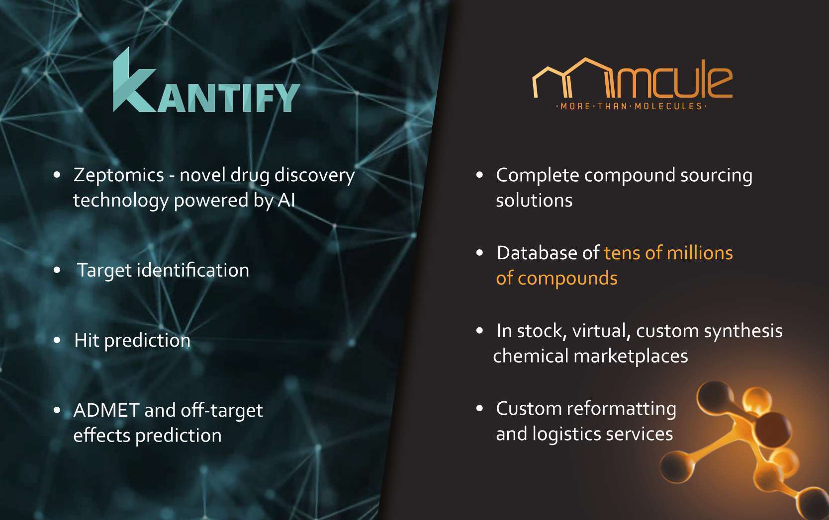 Drug discovery is a complex process. There is a wide search space, a high risk of failure and high costs. Until now, having the ability to identify and test promising ligands within a short period of time has been very challenging: inefficient hits, unsafe hits, unavailable compounds… many difficulties which can make the drug discovery processes slow and expensive. To tackle these difficulties, Kantify and Mcule work together to optimize the small molecule ligand identification process.